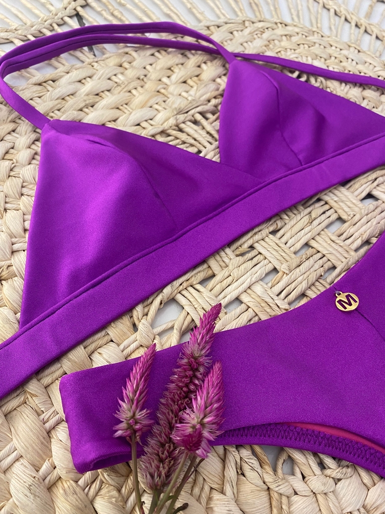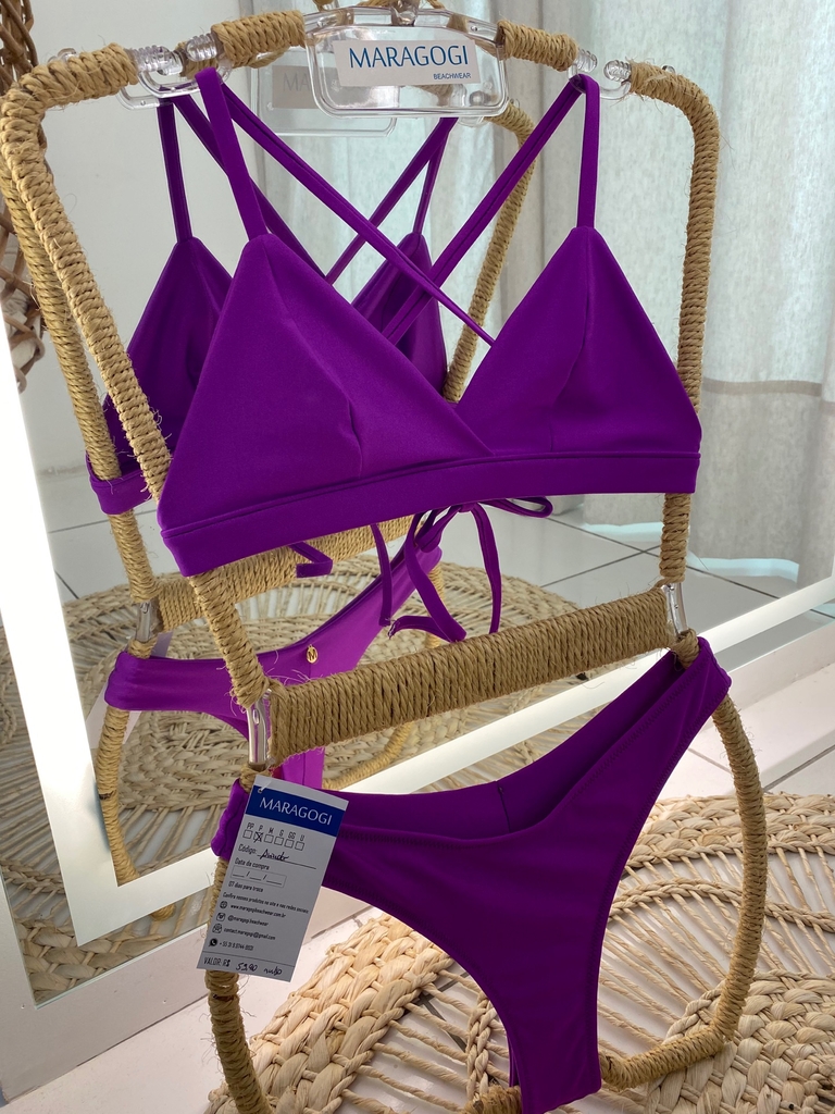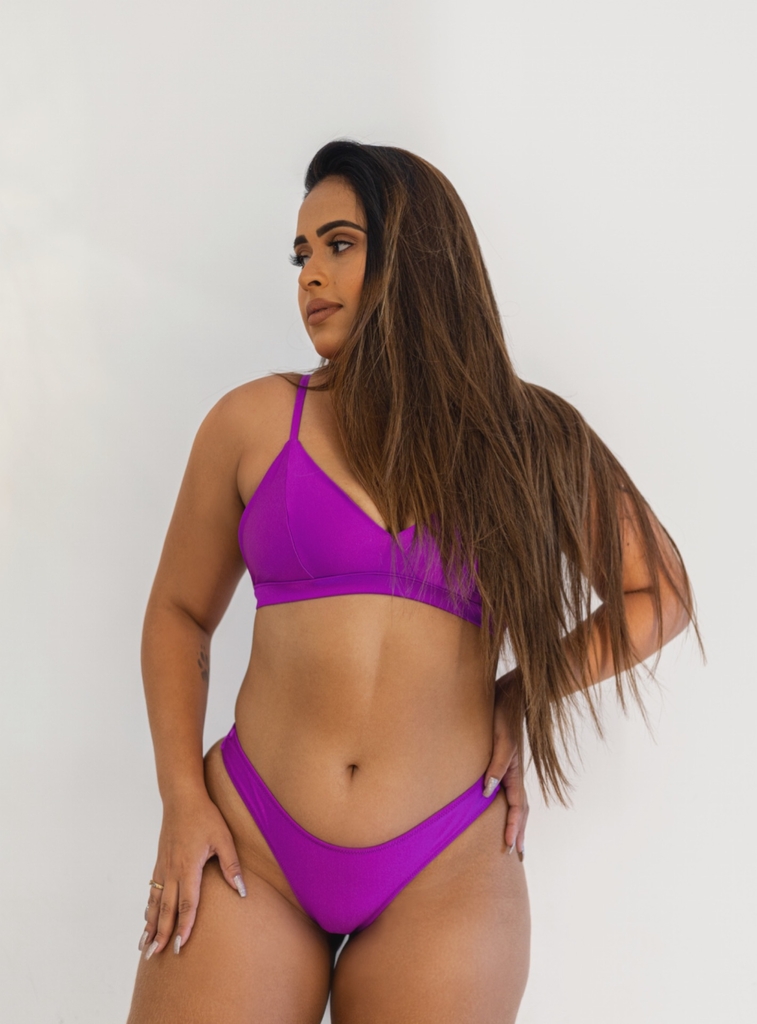 A parte de cima é um top fixo, que possui base elástica proporcionando conforto e segurança evitando que o busto saia na parte de baixo. Seu formato é triangular que proporciona uma marca similar ao top cortininha. Possui abertura para bojo removível (a peça é enviada sem bojo, caso deseje o bojo favor informar no pedido).
