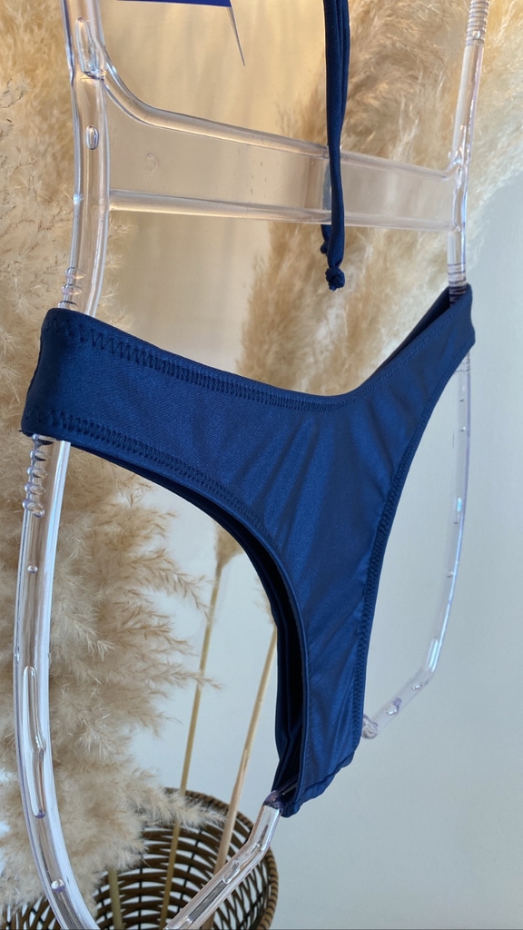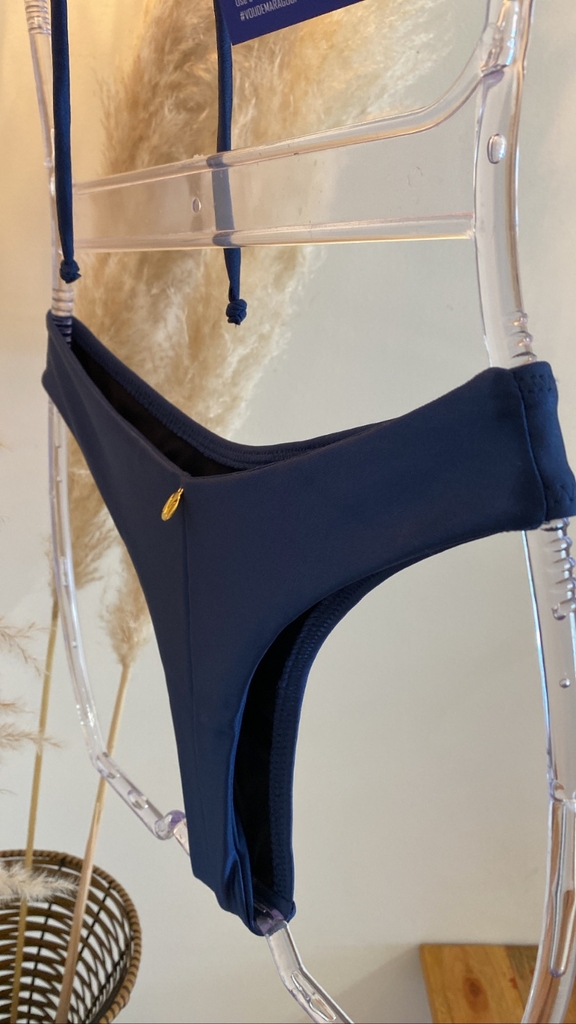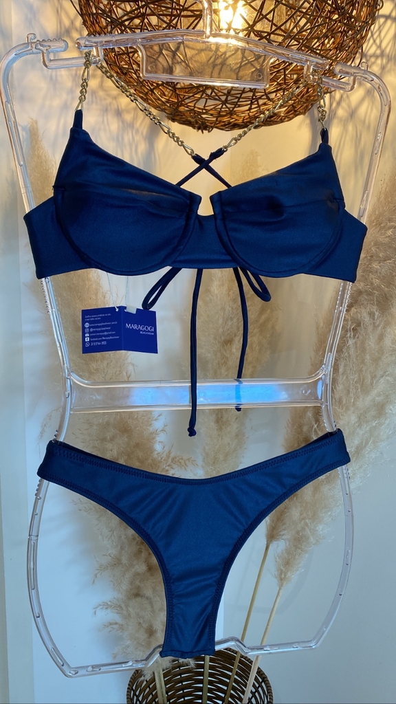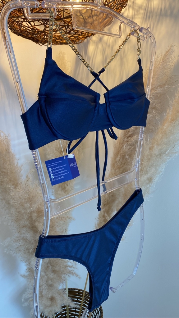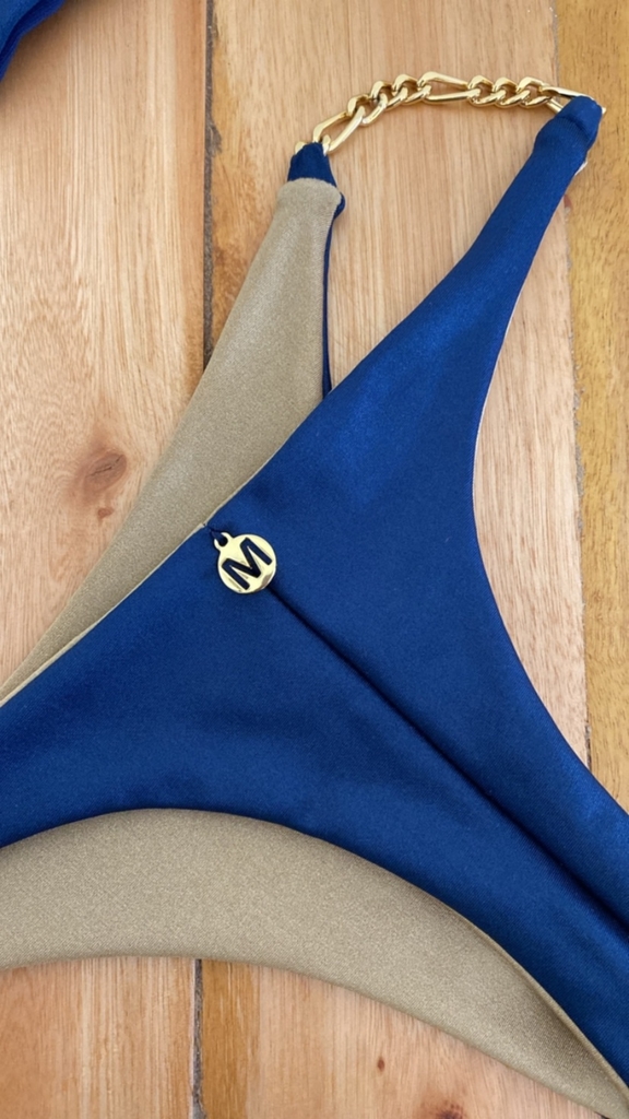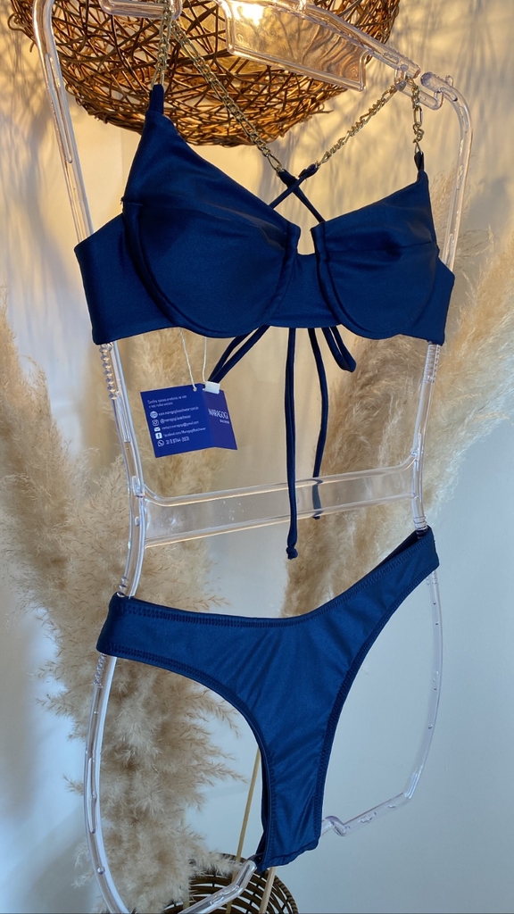 Já a calcinha tem a opção de escolha entre os modelos: duo (azul marinho e dourado) com corrente e aviador.