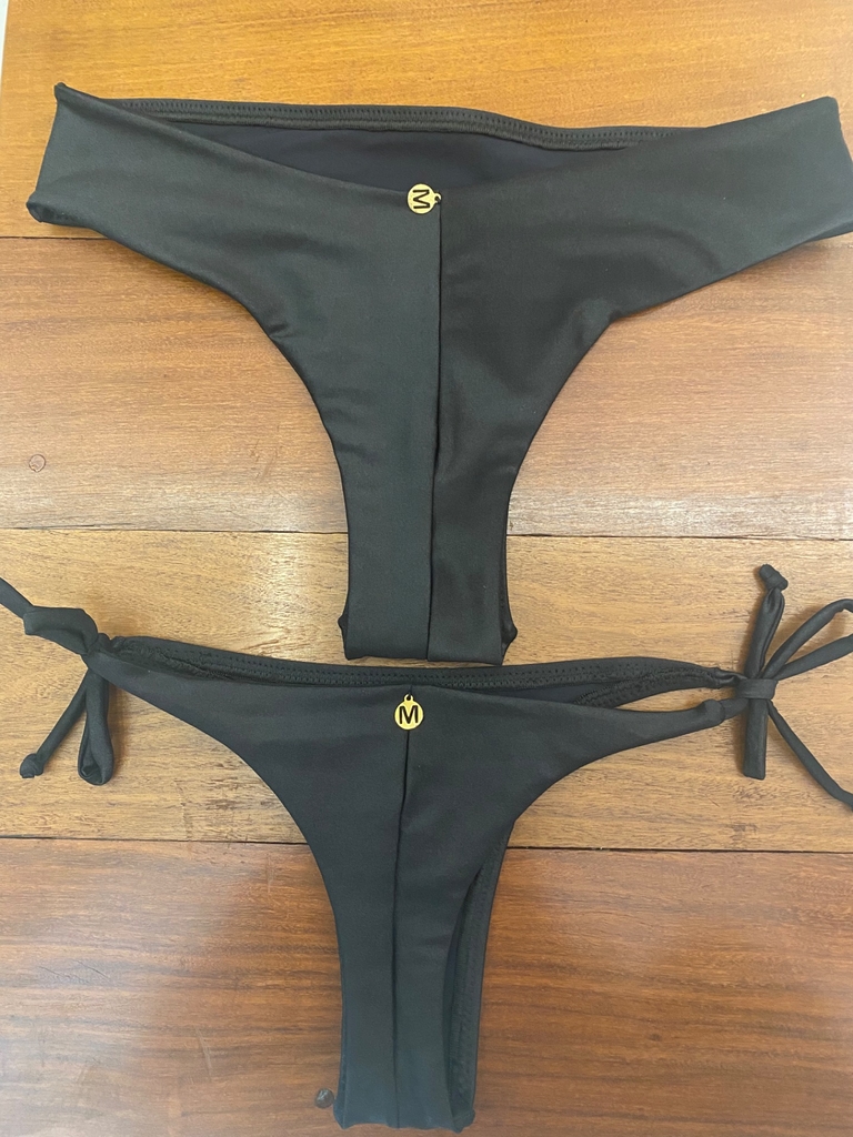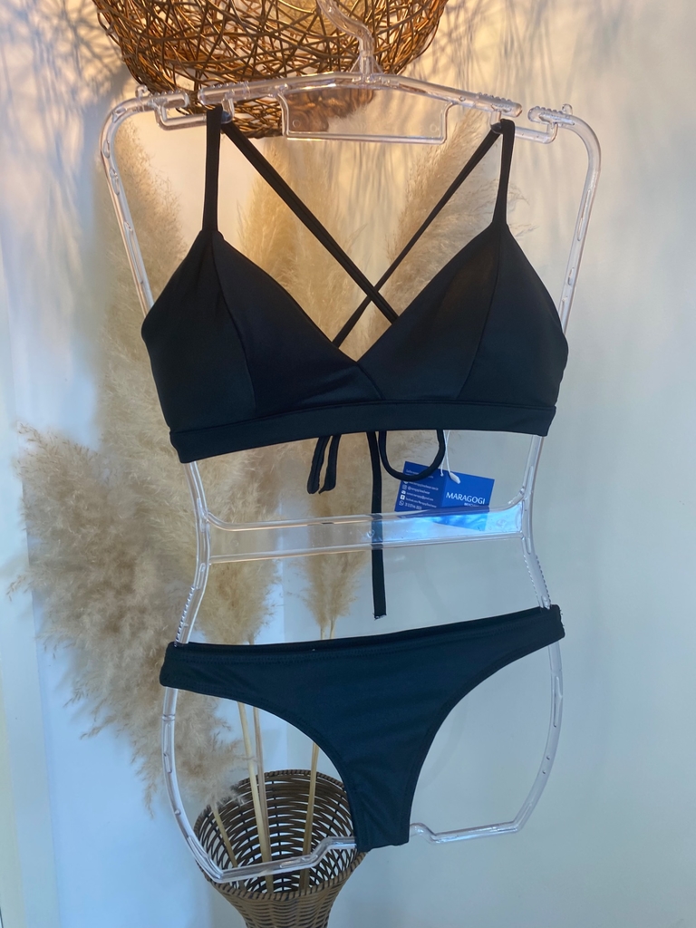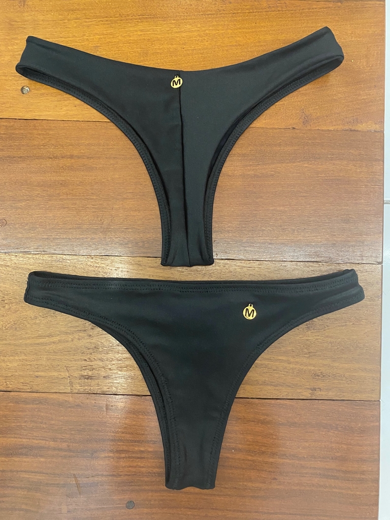 A parte de cima é um top fixo, que possui base elástica proporcionando conforto e segurança evitando que o busto saia na parte de baixo. Seu formato é triangular que proporciona uma marca similar ao top cortininha. Possui abertura para bojo removível (a peça é enviada sem bojo, caso deseje o bojo favor informar no pedido).