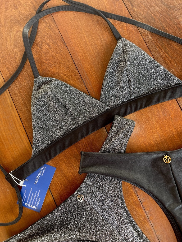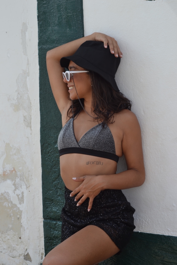 O top possui tecido de lurex na parte principal da frente e forrado com o mesmo tecido usado nas alças e base tornando a peça dupla com zero transparência!