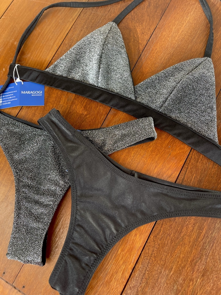 A parte de cima é um top fixo, que possui base elástica proporcionando conforto e segurança evitando que o busto saia na parte de baixo. Seu formato é triangular que proporciona uma marca similar ao top cortininha. Possui abertura para bojo removível (a peça é enviada sem bojo, caso deseje o bojo favor informar no pedido).