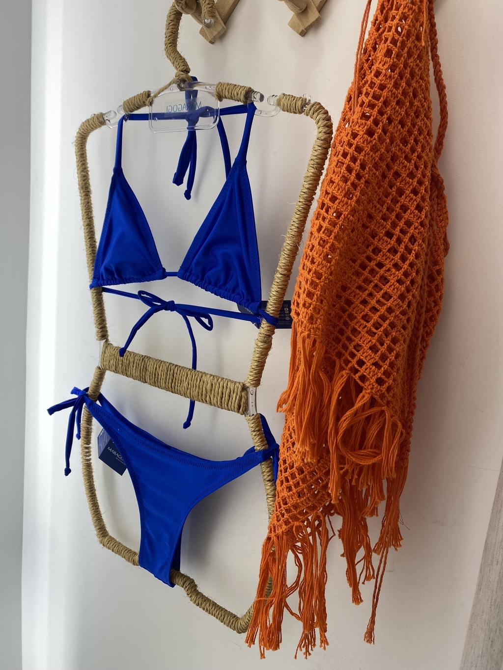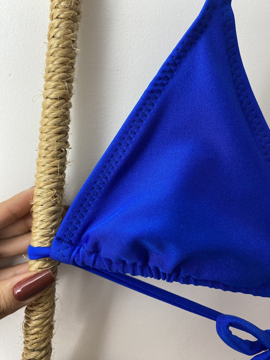 • A parte de cima é um top estilo cortininha, com alças reguláveis por amarração, confeccionado em tecido liso com leve brilho. Além disso, aqui você consegue definir se prefere a peça com bojo ou sem, fica a seu critério!