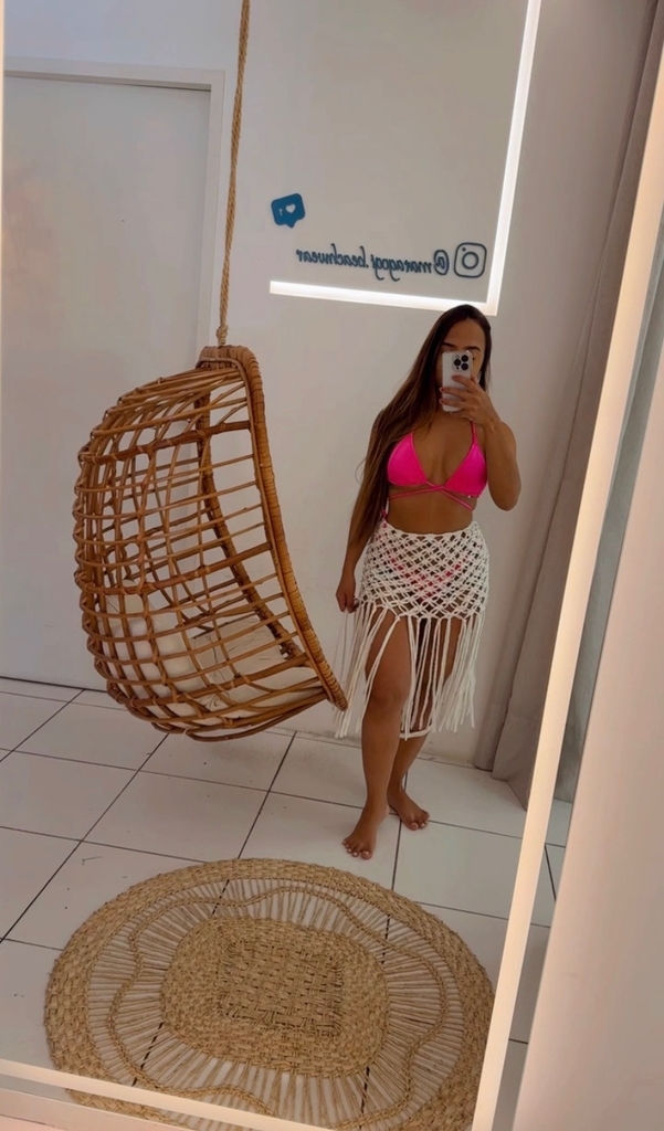 A saia é produzida artesanalmente feita à mão com fios de malha na técnica de macramê, que consiste em entrelaçar os fios de maneira elaborada e artesanal. A peça tem um estilo praiano, perfeita para ser usada em ocasiões informais ou em dias de praia. possuiu regulagem por amarração lateral e detalhe de franjas na ponta, o que proporciona conforto e praticidade no uso. Além disso, a saia é oferecida em dois tamanhos diferentes: curta e longa (sendo a curta acima do joelho e a longa na altura da canela faciilitando o caminhar), permite a escolha de acordo com o gosto pessoal e estilo de quem usa.