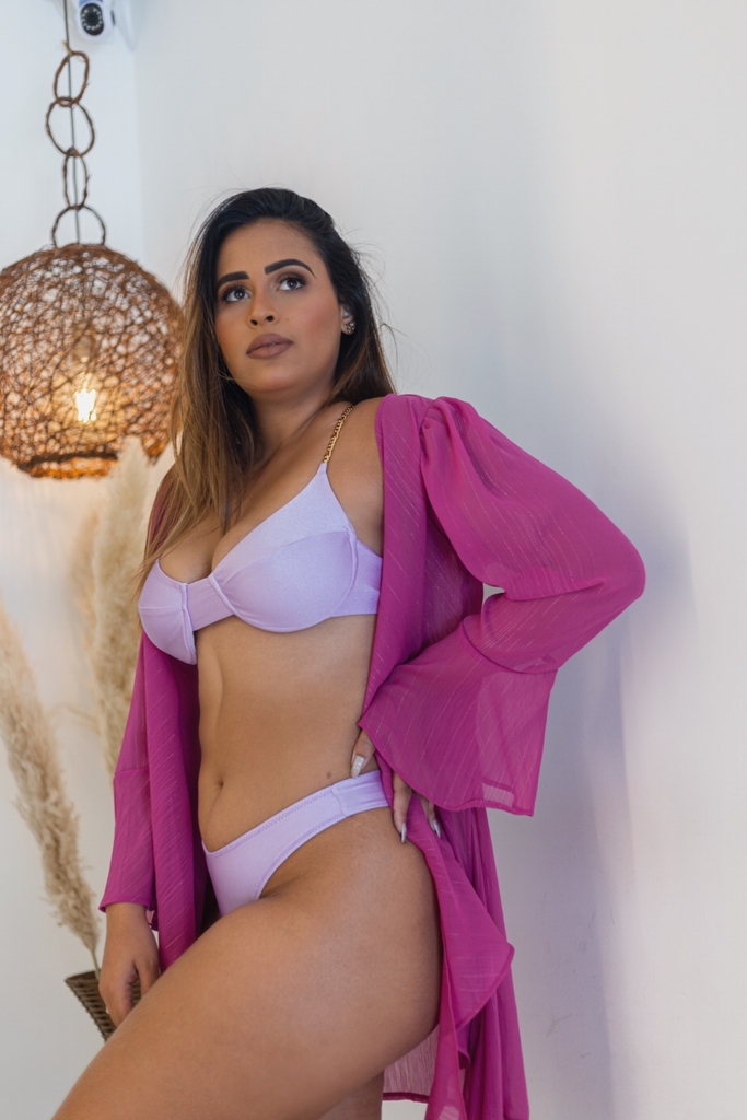 Esta saída de praia é confeccionada em tecido confortável e com leve transparência, composto por 100% Poliéster com fios de lurex o que permite maior fluidez e movimento.